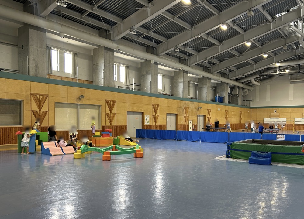 ソフトブロック、バランス遊具やボールプールがあり隣では三輪車、奥では卓球やバドミントンを楽しめるようになっています。