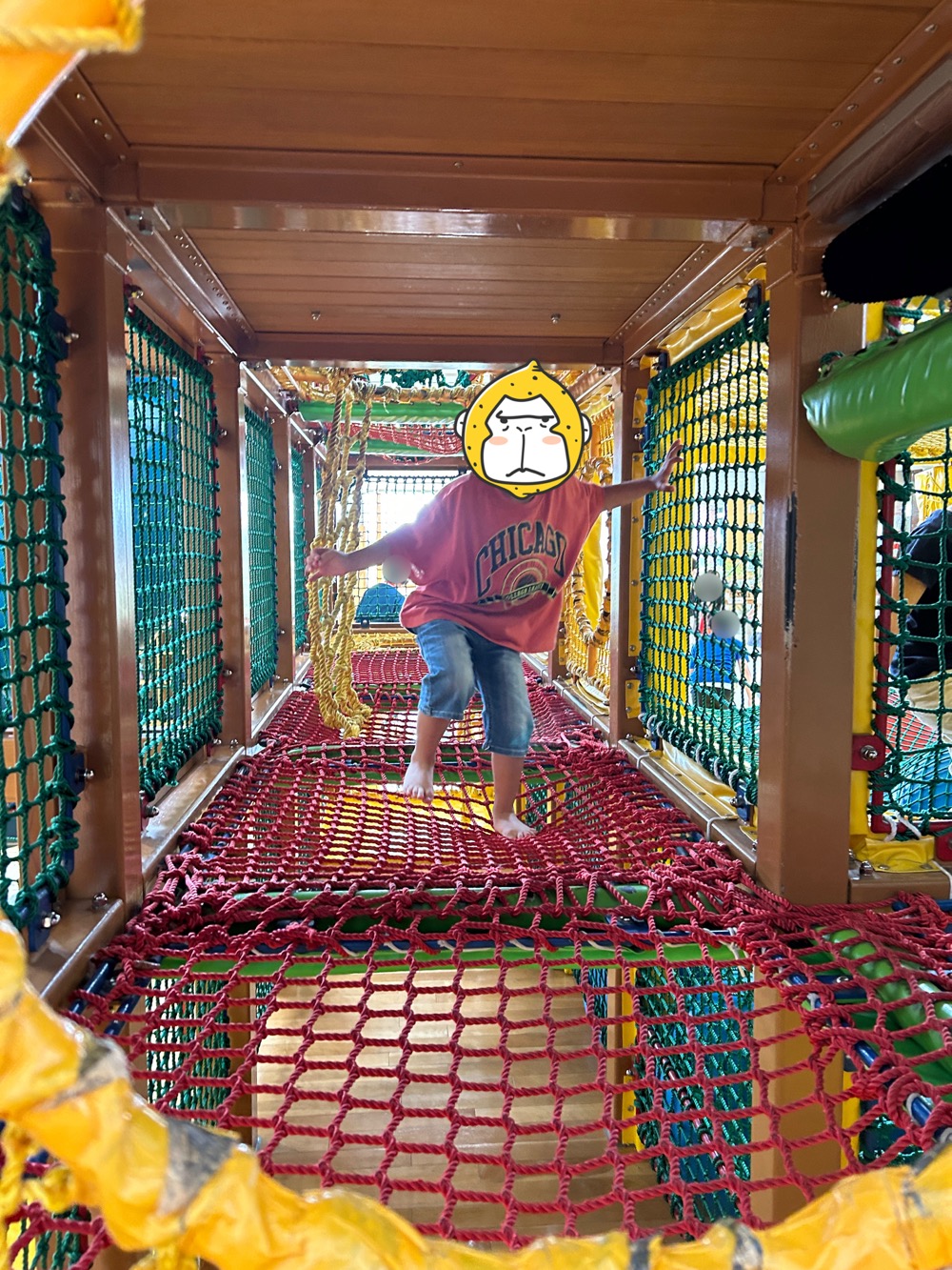 滑り台以外にもこの大きな遊具の中はネットの迷路のようになっていて、中央のボールの山を越えて横の穴から入ってみると…