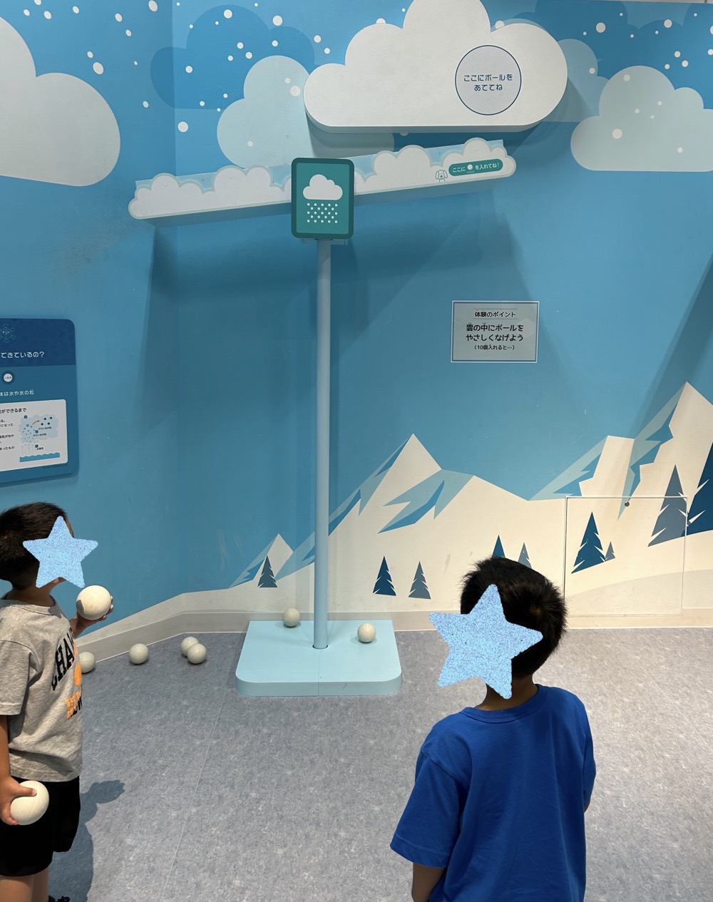 中で雪玉に見立てたボールを雲の中に投げ入れていくゲームで、決まった個数が雲の上に貯まるととどうなるのかな~??