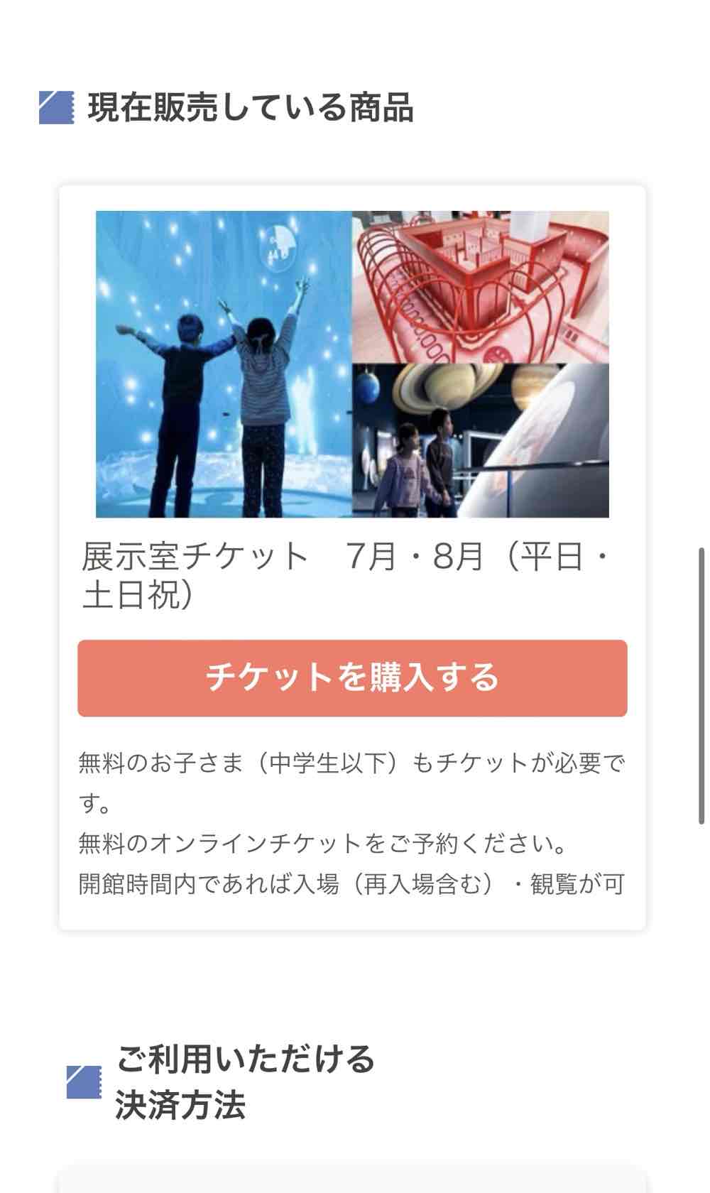 今回私は向かってる途中にオンラインで決済をして、受付でチケットのQRコードを見せてスムーズに入館することができました♪