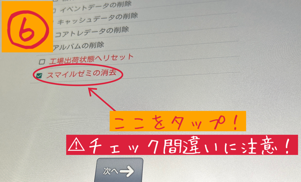 【スマイルゼミの消去】にチェックを入れ次へをタップします。