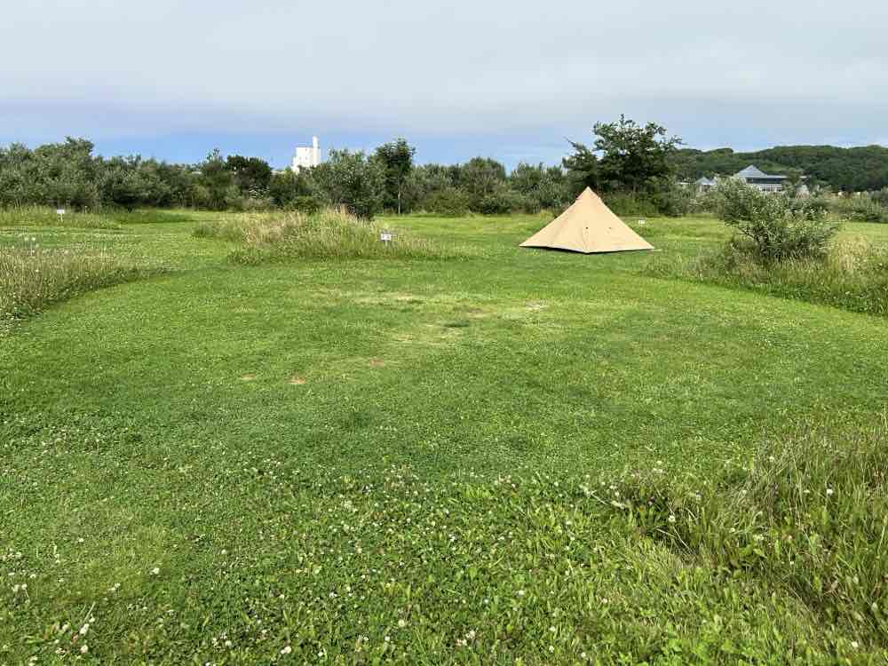 テントを張る場所は綺麗に芝が刈られていて、傾斜もほとんどないので良かったです。