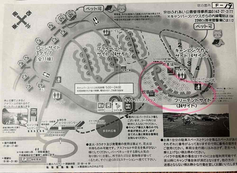 | 禁止事項 | カラオケ・発電機・焚火・直火(焚火台での使用は可能)打ち上げ花火 |