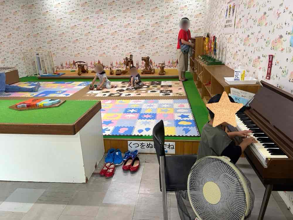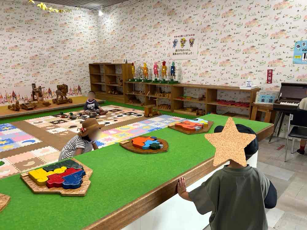 靴を脱いで入ると、パズルや木製のおもちゃが棚に綺麗に置かれていました。