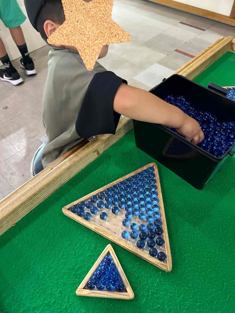 三角の枠の中にビー玉を敷き詰めて、1段1段重ねてピラミッド型にしていくんですがこれが意外に難しい~!大人も一緒にやるとこれがまた面白いんです。